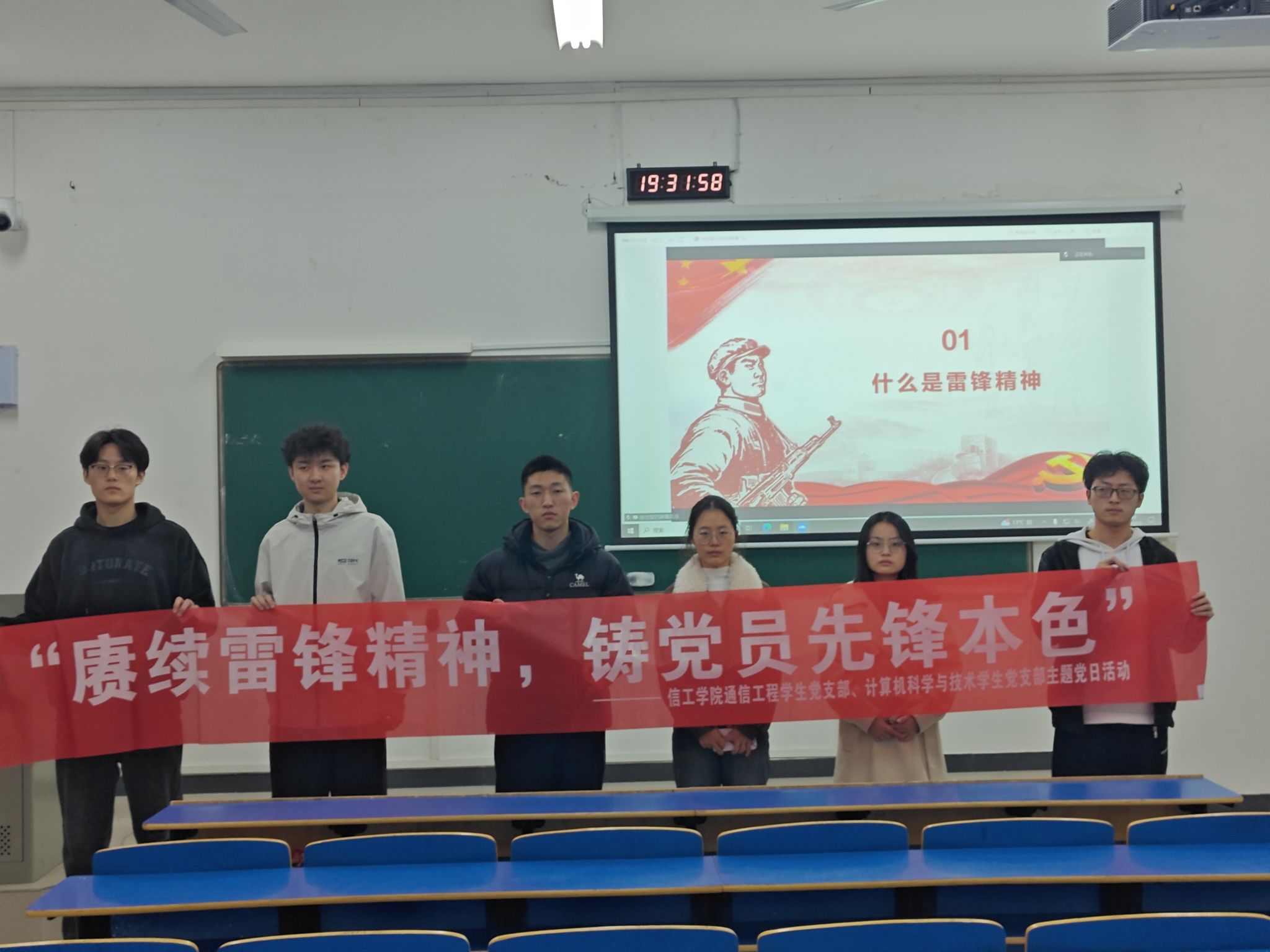 为深化新时代雷锋精神实践育人功能,3月14日,信工学院通信工程学生党支部、计算机科学与技术学生党支部与青年志愿者协会联合举办“赓续雷锋精神,铸就党员先锋本色”主题党日活动。