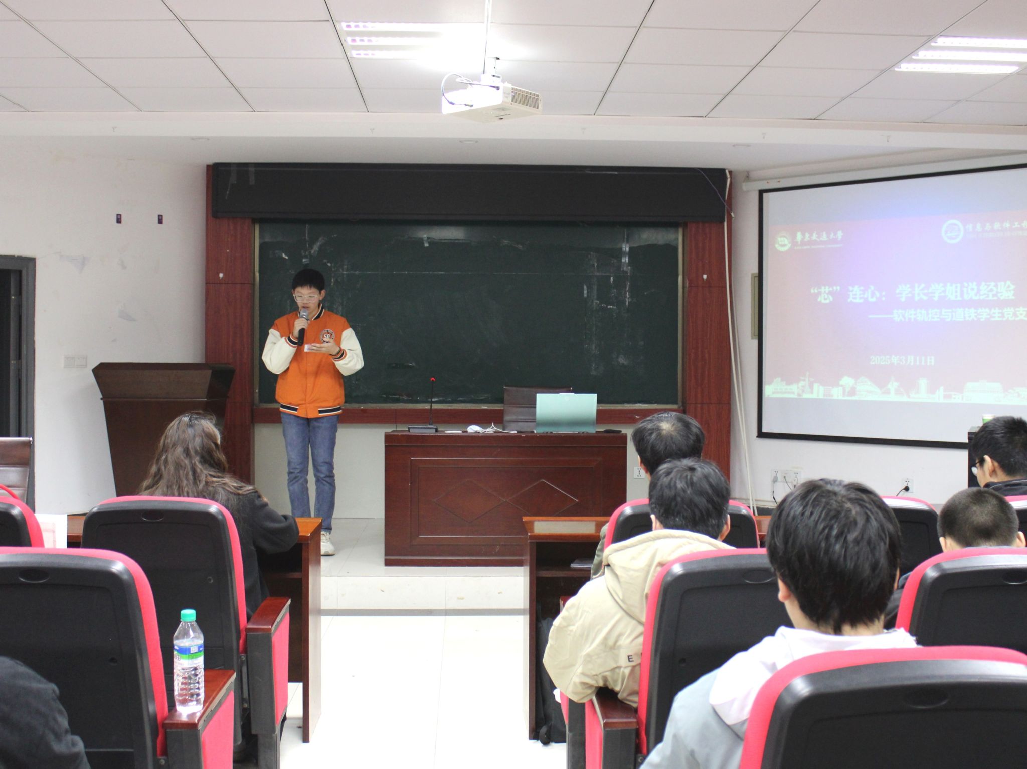 2025年3月11日,为促进学长学姐与学弟学妹之间的互动交流,搭建学习成长的桥梁,ok138cn太阳集团“芯”火辅导员工作室与软件轨控与道铁学生党支部在北区35栋一楼报告厅联合举办了“‘芯’连心:学长学姐说经验”主题活动。本次活动由24级人工智能2班副班长张沐曲主持,24级人工智能全体学生参与。
