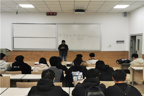 1班团支书张辰雨及2班团支书杨愉行介绍了党的十九届五中全会精神宣讲报告会的三点事项内容,并从:决胜全面建成小康社会取得的10方面决定性成就、我国发展环境面临的深刻复杂变化、到2035年要实现的9方面远景目标、“十四五”时期经济社会发展的6方面主要目标、实现奋斗目标的12方面具体举措这五个方面向全体同学进行讲述,一起感受我国在全面建成小康社会取得的重大改变及突破。当讲述“到2035年要实现的9方面远景目标”时,同学们积极抒发心中的憧憬与期待,言语坚定有力。