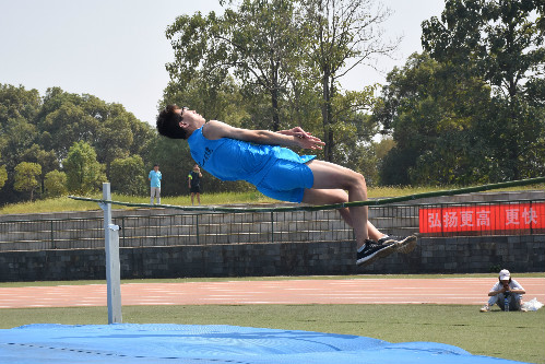 男子跳高从1.45m开始起跳,每次加5cm,每人每个高度均有三次机会。比赛开始前,信息学院的跳高运动员们不放过一丝机会,加紧热身、试跳,为接下来的比赛卯足一口气。比赛正式开始,三位运动员们保留实力,略显轻松,成功跳过第一杆,为接下来的升杆蓄力。一次又一次的助跑冲刺,一次又一次飞越竹竿……信息学院的运动员潘浩然一直在坚守。