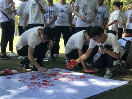 参与活动的同学们正在以手印绘制国旗