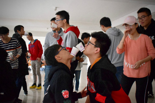 简单的手语教学首先将大家带入到残疾人的日常生活中。在随后的“耳听为实”环节里,同学们通过蒙眼的方式体验盲人的感觉,只能通过队友的提示走到终点完成指定动作,从很大程度上考研了团队成员之间的信任和配合。而“以嘴递水”则通过模仿无臂残疾人的方式考验了同学们的头部协调能力。
