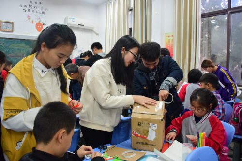 11月16日,青协秘书权益部携18级电子信息类1班的同学前往交大子弟小学,与小朋友一起用废纸盒制作各种有趣的手工艺品。“哥哥,我要用这个大纸箱做一幢别墅!”、“我想把纸片剪成玩具枪的样子,因为我还没玩过这样子的玩具枪。”……志愿者将不同形状的纸盒分发给小朋友,和他们一起动手实践。在小朋友新奇的脑洞和灵巧的双手下,纸盒幻化成别墅、魔术帽、长剑、手枪、时钟等精彩纷呈的作品。