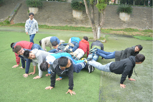 随后大家又通过报数进行了分组游戏。此次活动将所有同学分为了8个小组,每个组都要求起一个组名,设一个口号。游戏为两组对抗,赢得比赛的一组可以让输得一组获得一定的惩罚。比赛项目分为五个,分别为“民以食为天”、“抱团抬脚”、“穿越树洞”、“蒙眼运水瓶”和“十人九足接力”。