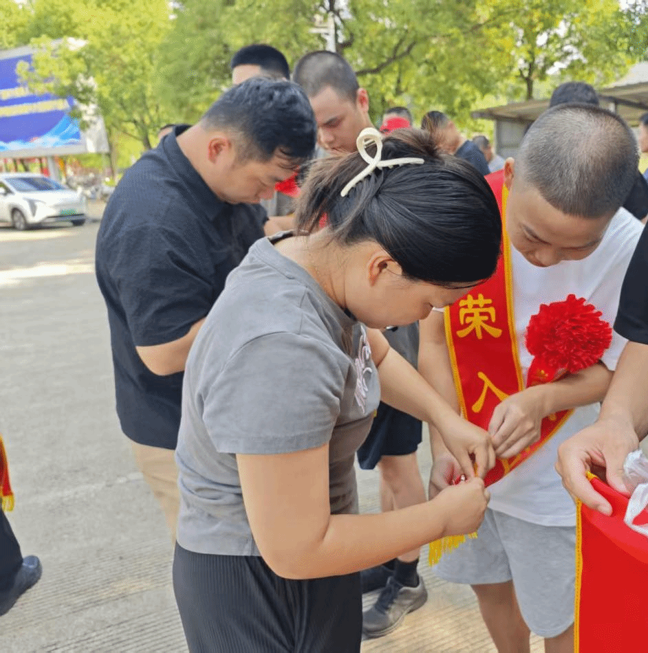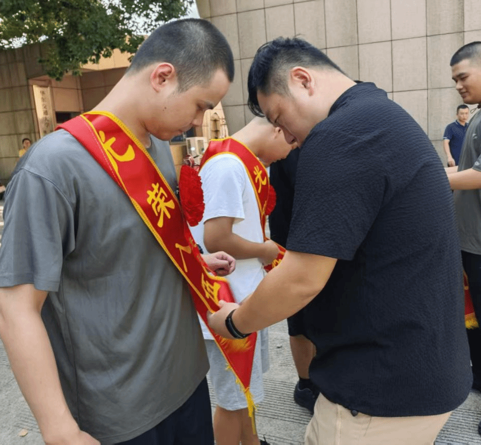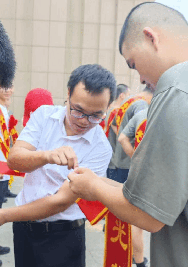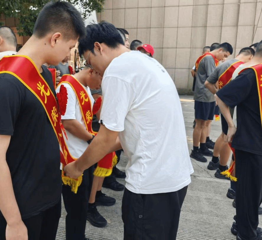 辅导员们为应征入伍的学生代表佩戴光荣绶带,红色绶带既承载着保家卫国的荣耀,也凝聚着母校师生的殷切期盼。